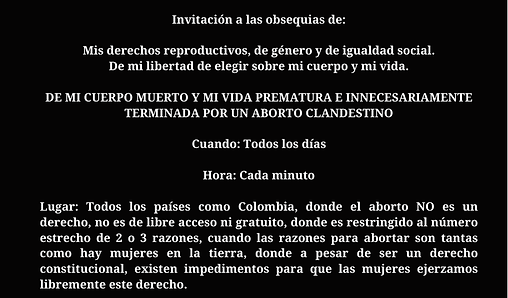 Two women, one of whom had access to a legal abortion (painted and dressed in pink), another who had a clandestine abortion and died from the consequences of the poor conditions in which it was performed (painted and dressed in black) walk through the streets of Medellín, while being chased by an executioner-patriarch, who whips them and shouts at them the arguments often heard from the so-called pro-life movement (people who are against women's right to have an abortion). The women tell their stories to those they meet along the way and ask people if they support free access to abortion in Colombia. This often derives into an impromptu exchange of the performers with the public: while women give their pro-choice arguments based on their own life and death stories, the executioner intervenes trying to gain the public towards his pro-life stance. Eventually, those who support the right to an abortion are given a flower by the women as a sign of gratefulness and solidarity, and to those who don't support it, the executioner hands them his business card, sarcastically inviting them to create alliances.